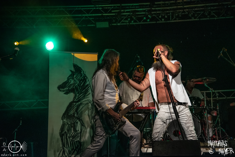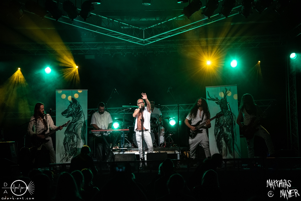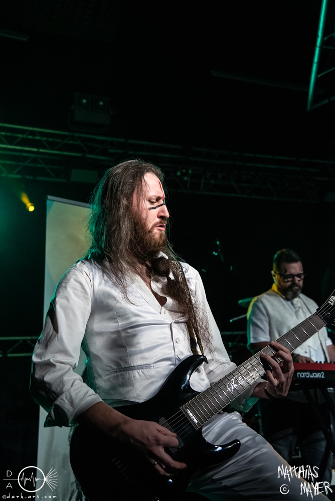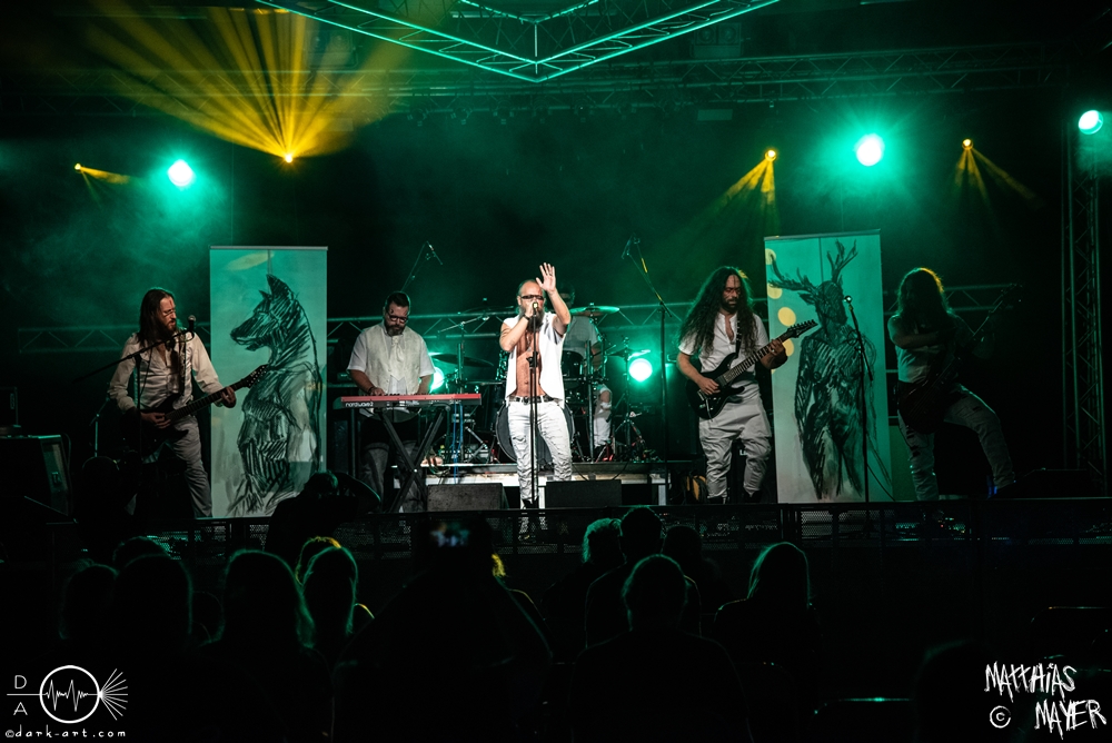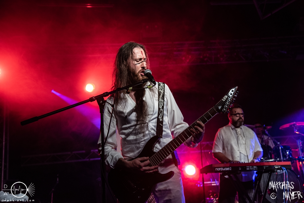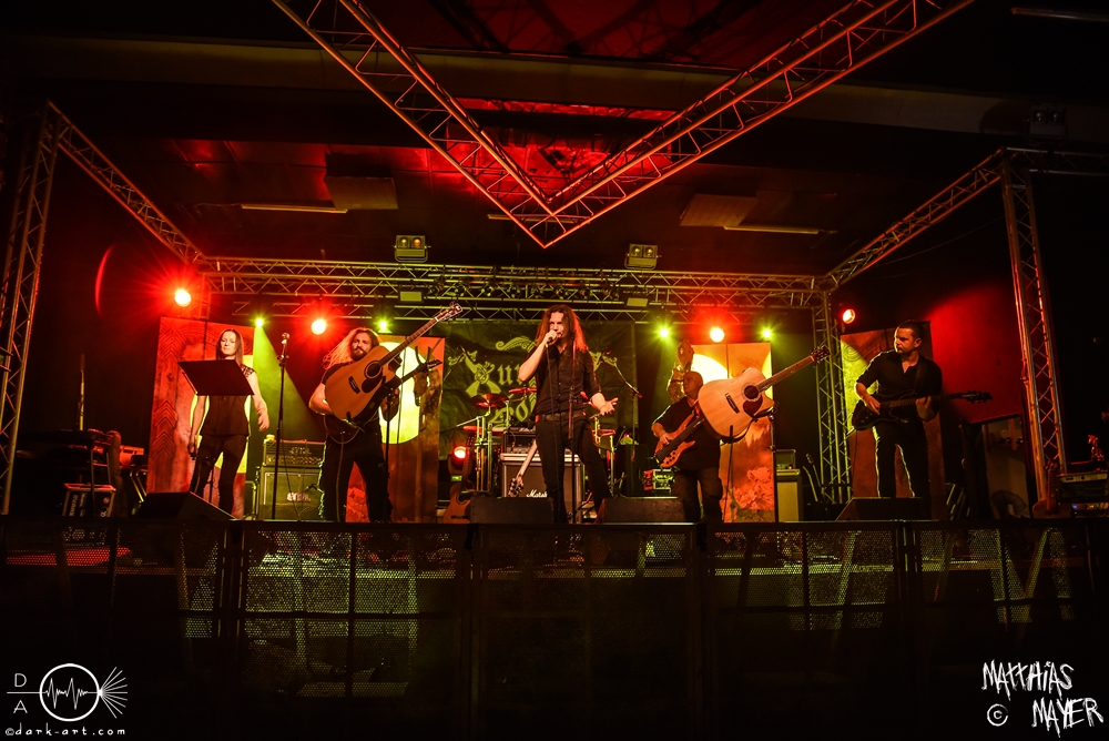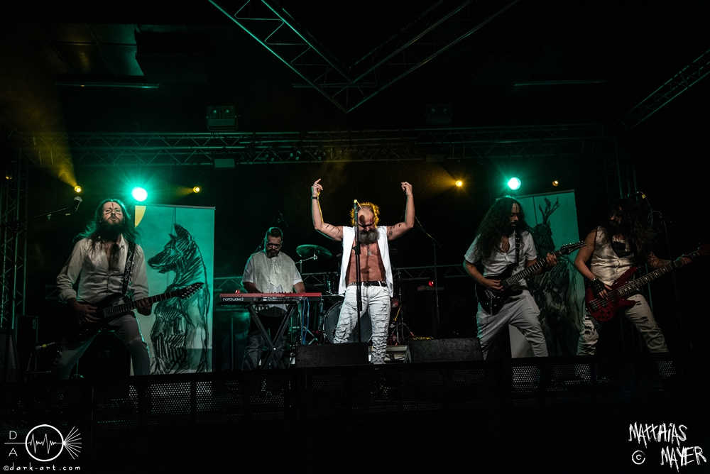Als nächstes folgte dann wieder etwas Außergewöhnliches und eine Band die mir bisher noch nicht bekannt war. „Arcana Opera A.W.“ heißen die Italiener, welche die 2te Band mit männlichem Gesang stellten. Komplett in Weiß, strahlten Sie eine Reinheit aus, die den ganzen Raum mit erstrahlen ließ. Nun wie soll man die Musik beschreiben? Das fällt mir etwas schwer, da hier einmal wieder viele Stile und Grenzen und Genres gesprengt werden. Es ist auf jeden Fall Metal, es ist auf jeden Fall symphonisch und folkig, war es in dieser Form bis dato einzigartig für mich. Und das Ganze dann auch noch mit Italienischen Texten im Cleanen Gesangsstil untermalt lies alles sehr kunstvoll und elegant auf mich wirken. Trotz der hohen Kunst blieben Stimmung und Feierlaune aber nicht auf der Strecke und ein weiterer Höhepunkt für mich wurde geboren.