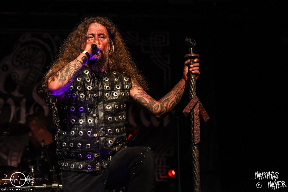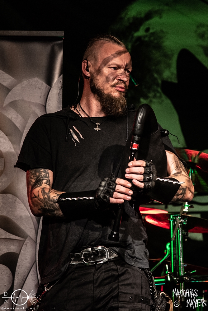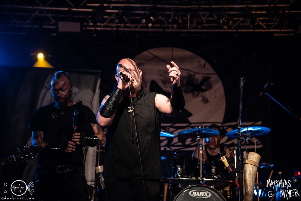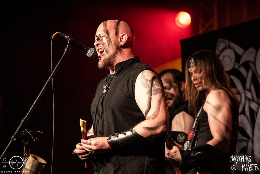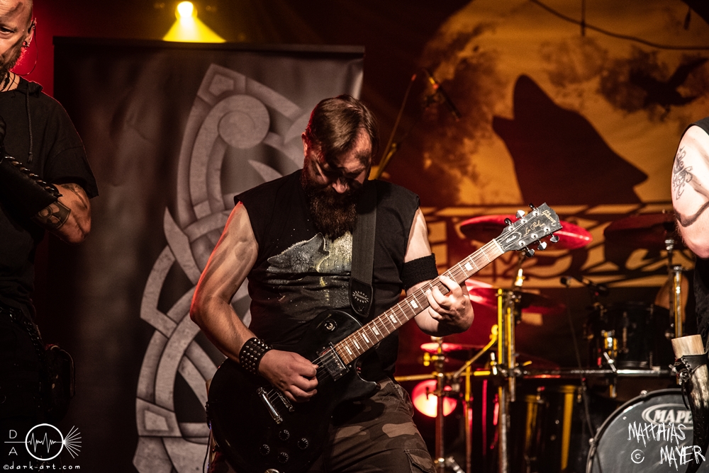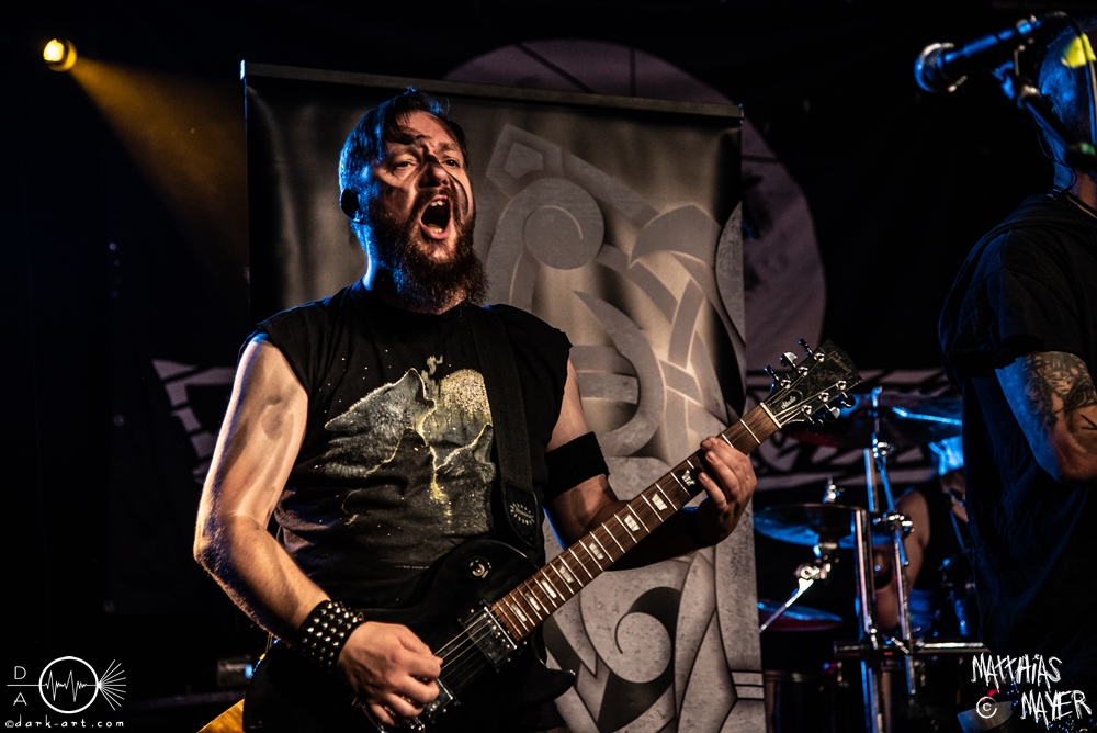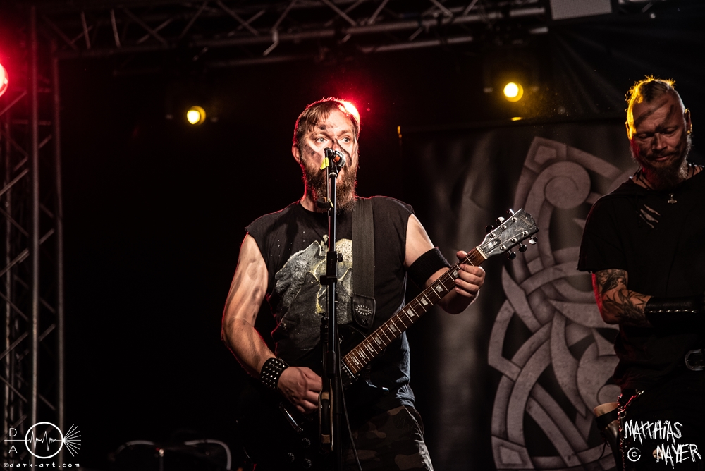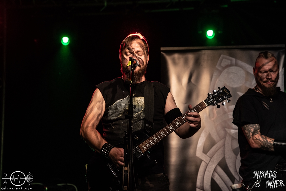 Und „Schwups“ da wart es schon 23 Uhr als der Umbau für den Freitag Headliner begann. Der Abend jedoch blieb im Zeichen der Heidnischen Götter stehen und es kam wieder eine seit über 20 Jahren aktive Band u Wort, welche ich nun auch schon länger nicht mehr live oder im Programm stehen hatte sehen. Das letzte Album „Tiwaz“ erschien auch bereits 2013 bei Massacre Records bevor es etwas stiller wurde um „Thrudvangar“. Jedoch immer noch schön zu sehen, dass die Herren weiter aktiv am Viking/Black Metal teilnehmen. Für mich als Fan der frühen Tage stellt sich hier direkt wieder die Frage, wann und wird es ein neues Album geben? Das wäre sicherlich sehr interessant. Bevor ich jedoch den Leser dieses Artikels zu sehr in meine Gedankenwelt entführe und mir meinem nostalgischen Gegrummel langweile, kommen wir zurück zu dem, was auf der Bühne und in der Halle passiert ist. Warpaint, Rüstung und „Cojones“, eben alles was einen richtigen Wikinger ausmacht und als wären sie nie „stiller“ geworden. Und so wurde die Stimmung, welche inzwischen schon im ganzen Haus am Toben war noch einmal zum Überlaufen gebracht. Party am Platz, aber Party dachten sich nun auch einige Fans und stellten fest, dass auf der Stelle tanzen zwar nicht dasselbe ist wie unter Leuten, aber immer noch besser und passender als nicht zu Tanzen. Was ich bei uralten Klassikern wie „Heilige Flamme“ bereits vom Erzählen her glauben würde, denn hier gab es auch für mich kein halten mehr.