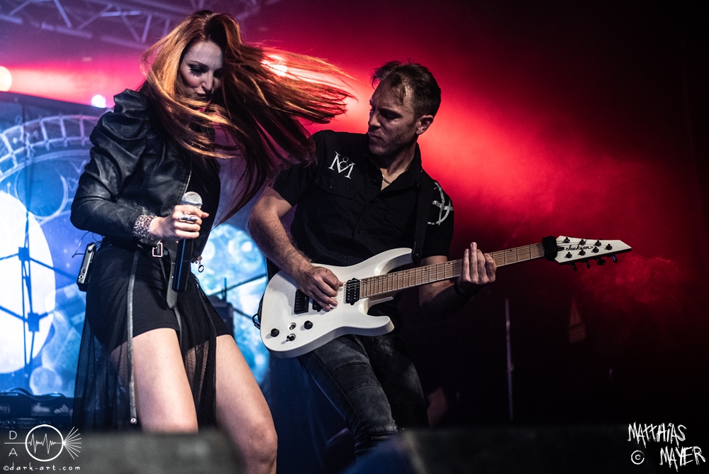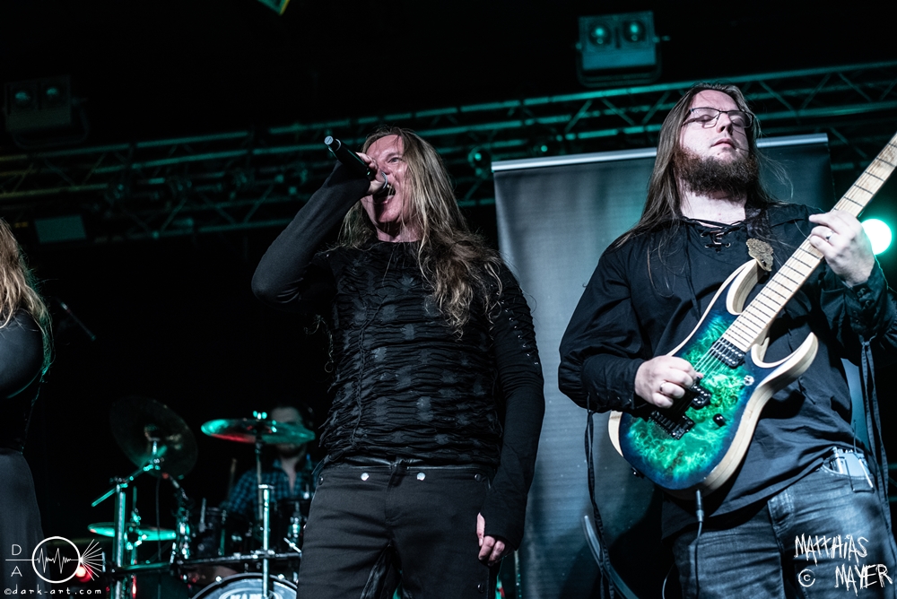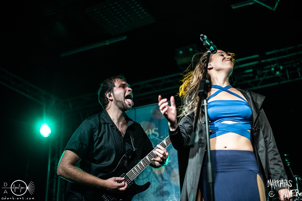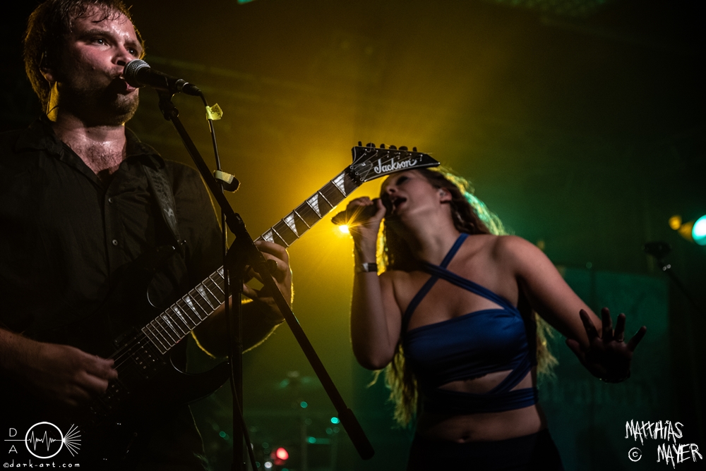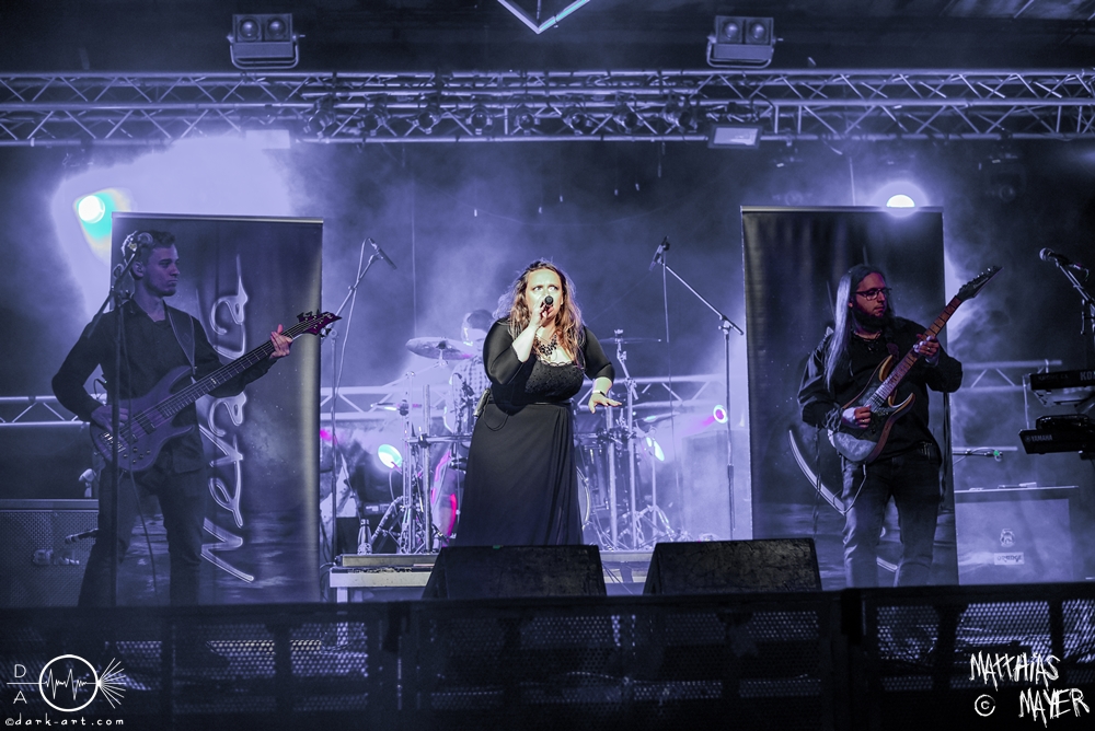 Und nun kam ein ganz besonderes Bonbon für mich persönlich auf die Bühne. Wobei es sich hierbei ja nur um ein Bonbon aus der ganzen Packung handelte. Die Regensburger Symphonic Metal Band „Nevaria“ war an der Reihe. Eine Band die dem ein oder anderen inzwischen sicherlich ein Begriff seien dürfte. Im Herbst 2019 erschien das Debutalbum „Finally Free“ und ist jedem Freund des Genres nur ans Herz zu legen. Und auch die Interaktion auf der Bühne ist ein völlig richtig umgesetztes Element der Band. Die Interaktion zwischen Sängerin „Tanja“ und Keyboarder „Markus“ (welcher den Gesang mit härteren Einlagen unterstütz) aber auch die Bewegung an Gitarre und Bass geben ein rundes und schönes Auftreten und Bühnenbild ab. Songs die alle Herzen von Nightwish bis Epica Fans überzeugen dürften mit etwas mehr rockiger Stimme als in Richtung der eben genannten. Eingängig, träumerisch, atmosphärisch und der richtigen Portion Metal. Da lachte einem das Herz, denn was will man großartig mehr?