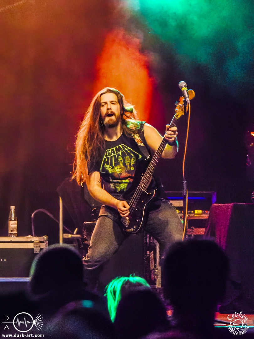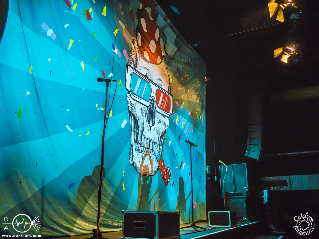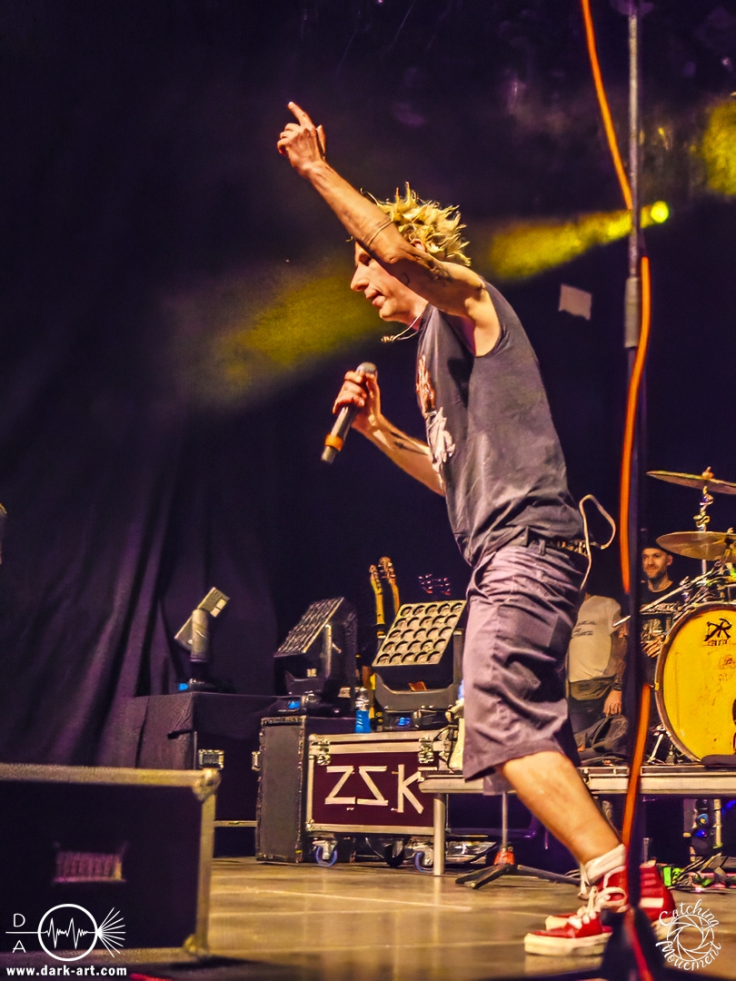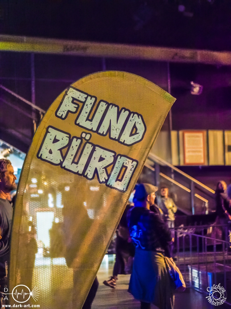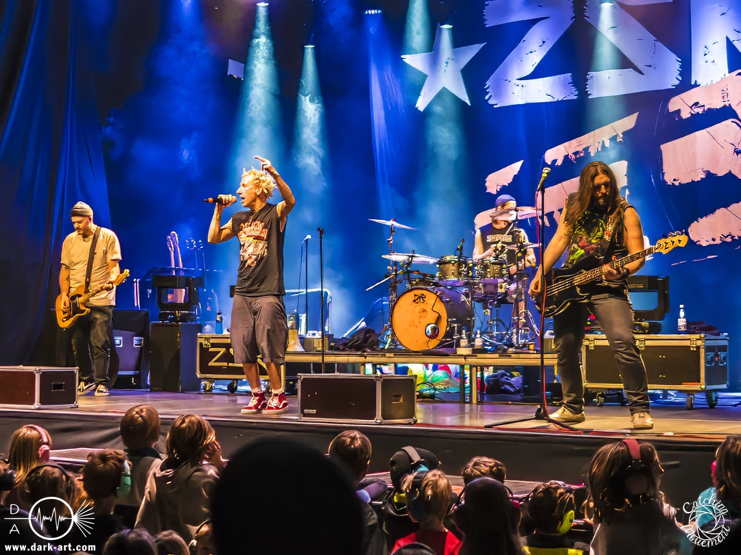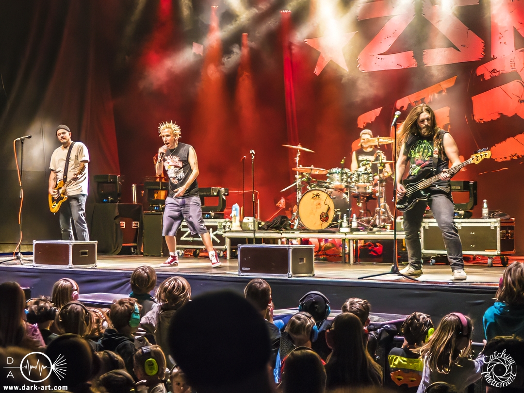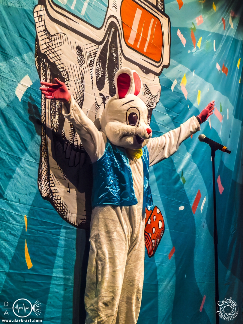 Pünktlich um 16 Uhr ging es los. Zunächst kam ein großer Hase auf die Bühne, der die Kids fragt,e ob sie bereit seien, alle auch schön ihren Gehörschutz auf hätten, und ZSK sehen wollten. Was sie natürlich laut bejahten, also los ging es. Über die Setlist muss ich nicht viel berichten, da könnt ihr einfach den Bericht aus dem Café Central lesen. Darüber hinaus gab es aber durchaus berichtenswerte Situationen. Joshi hatte wohl vorab einige E-Mails von besorgten Eltern erhalten, mit der Bitte,dass die Band zu diesem Anlass keine Schimpfwörter benutzen solle. Er hatte natürlich eine entsprechende Beispiel-Liste dabei, damit er auch illustrieren konnte, welche solche schlimmen Wörter sind; etwa Furzkanone, Gesichtsmülleimer oder Schleimkopf. Die Wörter wiederholte er natürlich auch. Aber auch Hannes bekam seinen Moment. Er wurde schon alleine deswegen von den Kids gefeiert, weil er Feuerwehrmann ist, aber auch dafür, dass er die Show rettete. Die Band erzählte, dass sie einen Reifenschaden auf dem Weg von Saarbrücken nach Frankfurt gehabt hatten, und Hannes hatte den kaputten Reifen so schnell gewechselt, dass alles zeitlich noch klappte. Schließlich brachte Joshi dann noch den Hinweis aufs „Fundbüro“ an; in diesem Fall eine in Richtung Bar stehende Fahne, auf der „Fundbüro“ stand.