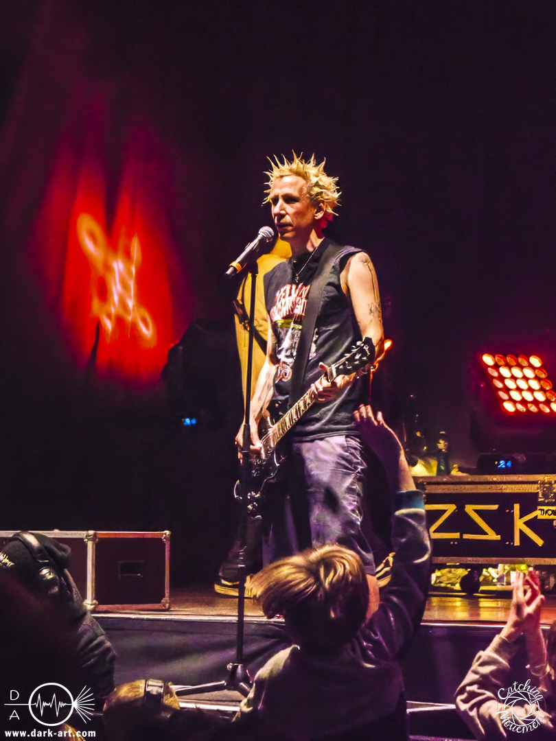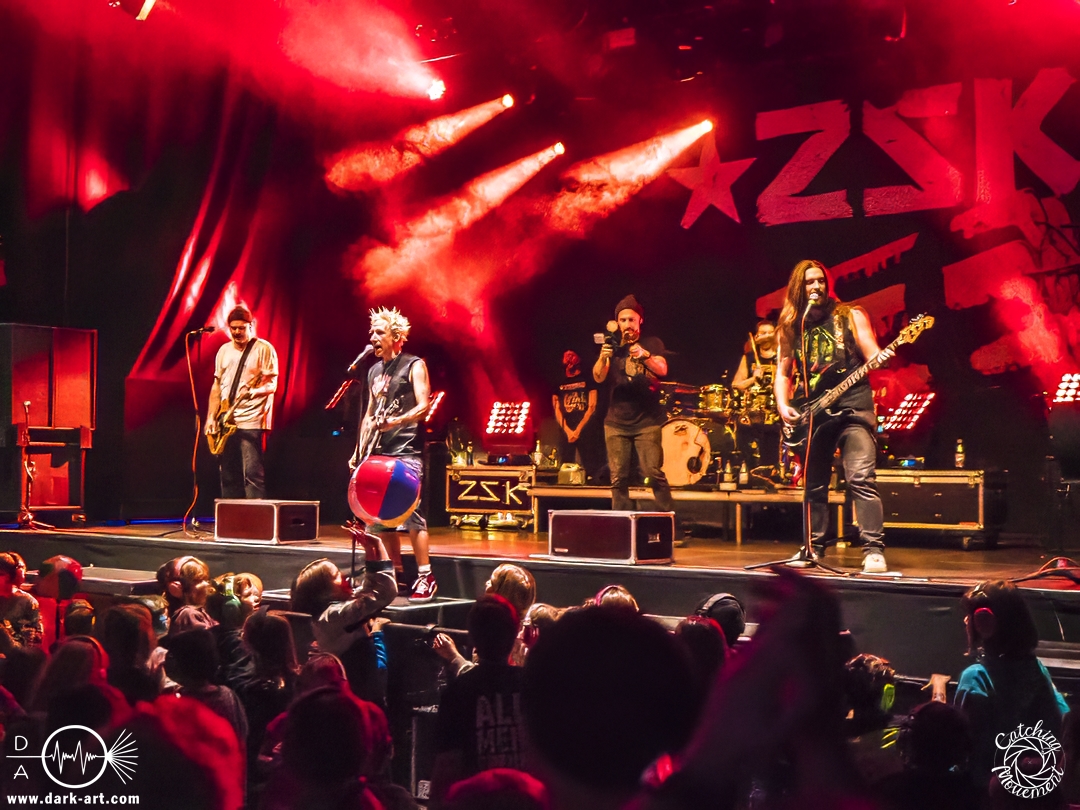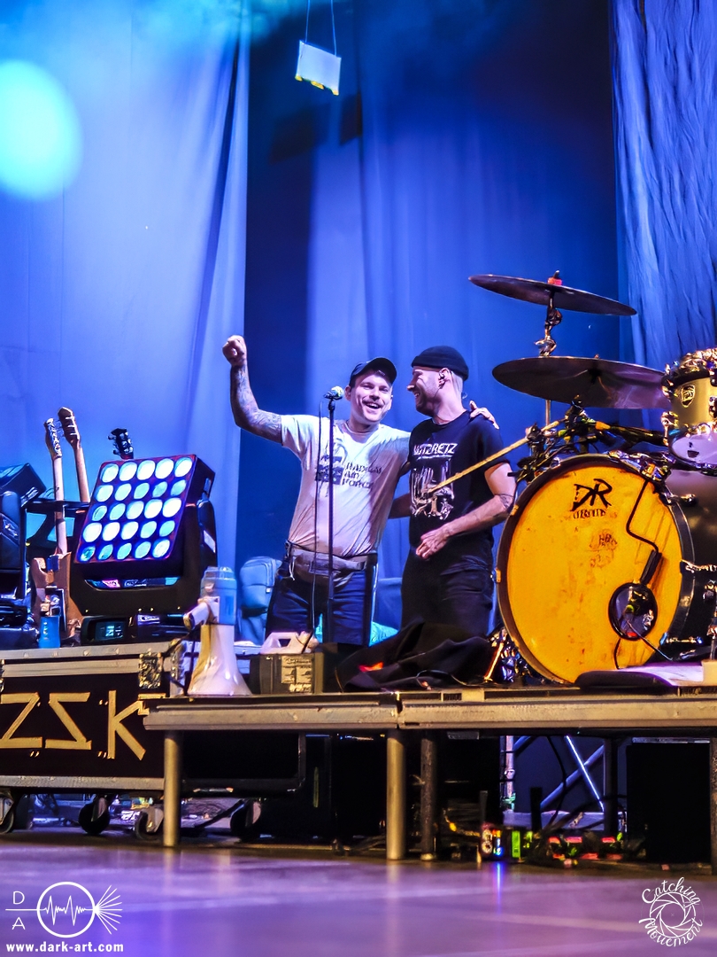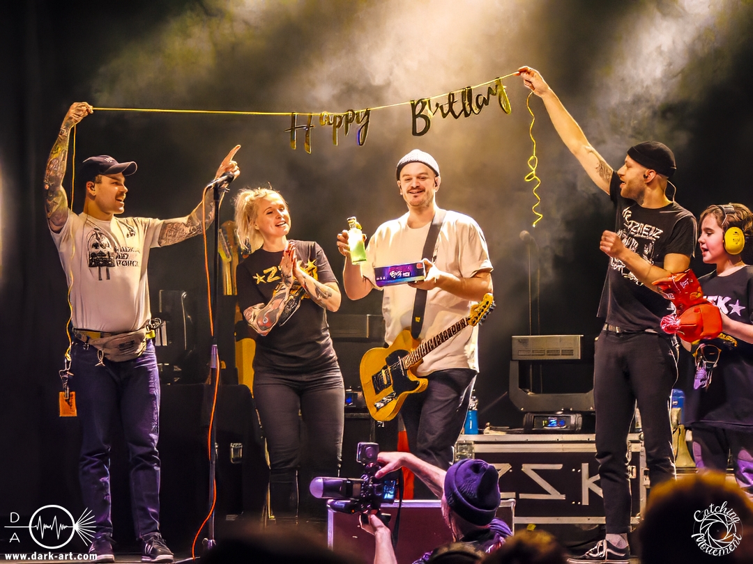 Vor Alle meine Freunde betonte er auch noch mal, dass man ja keine Schimpfwörter sagen dürfe, allerdings mit einer Ausnahme: Dann nämlich, wenn es um die AfD geht, denn das sind Arschlöcher. Logischerweise brachten die Band hier auch die „FCK AFD“ Fahne auf die Bühne. Anschließend gab es auch eine etwas größere Auszeit, denn es gab ein paar Sachen zu feiern. Zum einen war dies für die 52. Show des Jahres, inklusive sechs Kinderkonzerten. Zum anderen war Joshi geflüstert worden, dass ein anwesendes Kind am heutigen Tage 10 Jahre alt geworden sei. Das Kind durfte daher auch auf die Bühne kommen und bekam ein kleines Geschenk, bestehend aus einer Tüte Flips und einer ZSK– Wintermütze. Allerdings war er nicht das einzige Geburtstagskind: Arne, der Gitarrist, hatte nämlich auch Geburtstag – bekam allerdings eine Schnapsflasche geschenkt. Und schließlich gab es noch Lob von Joshi, der anmerkte, dass er es richtig gut fand, dass so viele Eltern ihre Kinder mit Verstand und gegen Faschismus groß ziehen.
